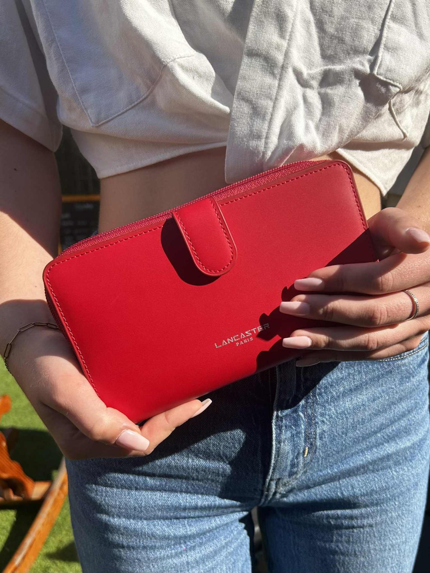 Laissez-vous séduire par ce beau compagnon Lancaster en cuir rouge lumineux qui conjugue qualité et élégance intemporelle.